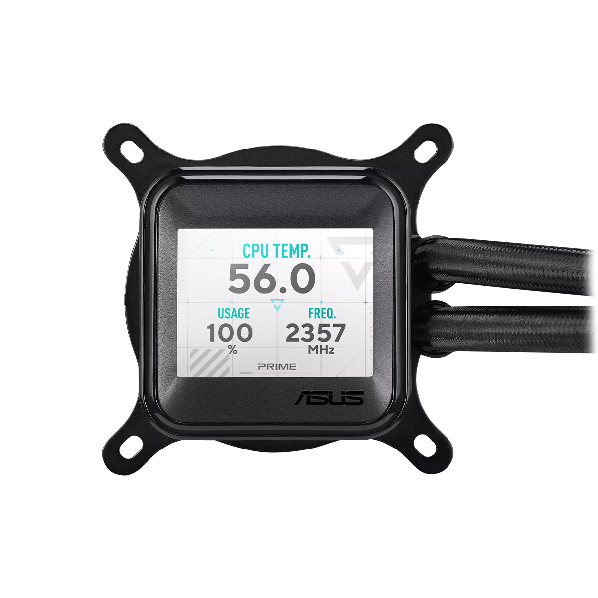ASUS Prime LC ARGB LCD all-in-one CPU liquid cooler with sharp screen showcasing CPU & GPU information with different background, high-performance Asetek pump armed with robust motor, daisy-chainable fans